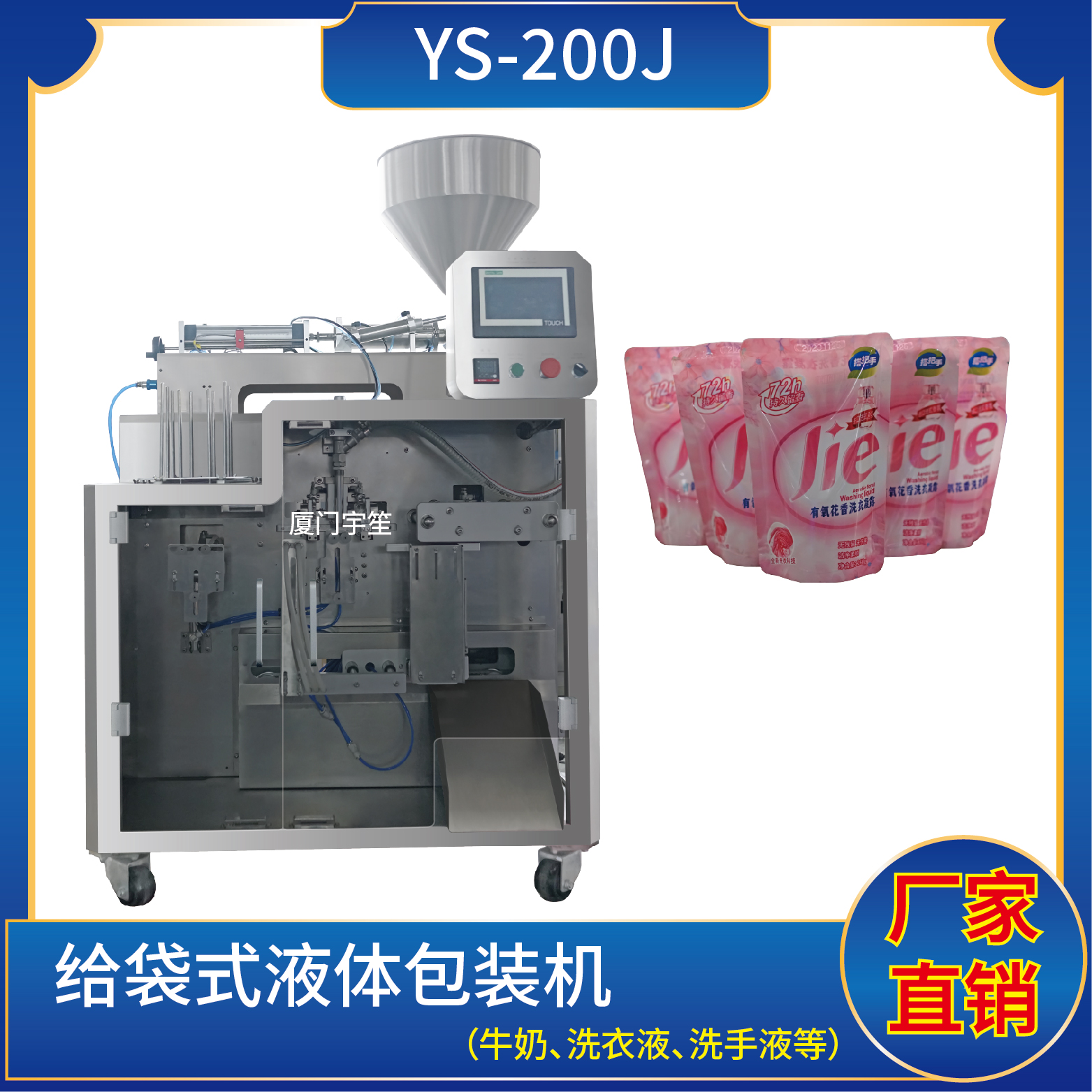 適用于食品、醫(yī)藥、化工、化妝品行業(yè)中液體、醬料等物品的計量包裝,如:洗衣液、消毒液、果汁、酸奶等。